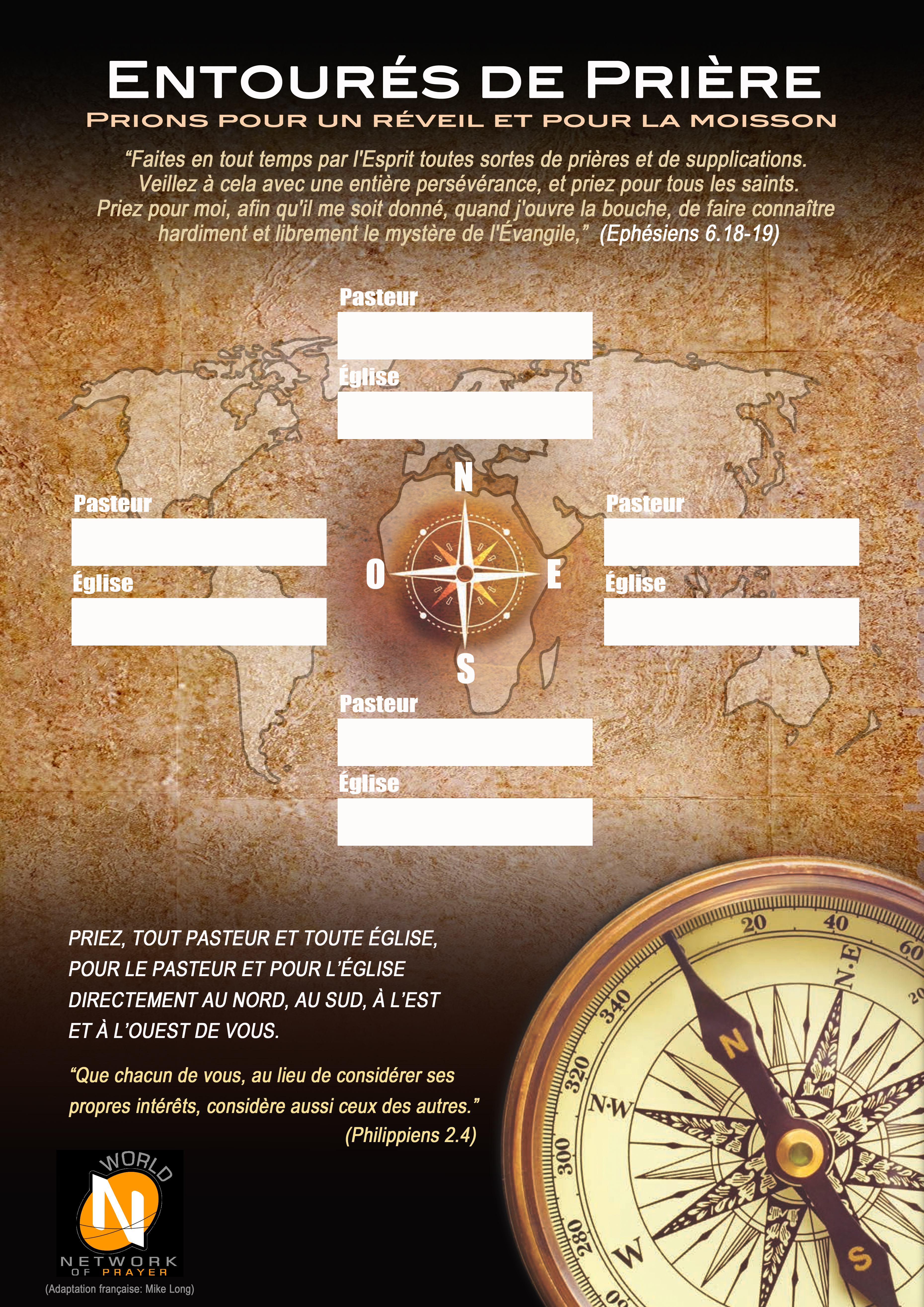 This week we received the WNOP Prayer Net poster, a visual reminder to pray for the churches and pastors to the North, South, East & West of us. I adapted it for use in our local church in French. If you would like to use the French adaptation, click on the image below to download a full resolution version: One has a world map, the other, a map of France.