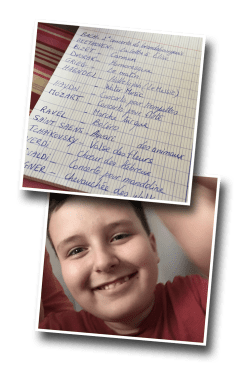 He had to learn them to the point that, listening to an excerpt, he would be able to identify both the composer and the title of the work. He’ll be tested next week and he’s doing pretty good!