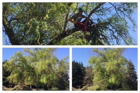 - I’m thankful for the Lord’s protection while we were working. The year prior to our arrival, a lot of work was done on the hedge, but because Bro. Brochu was a fully appointed missionary, his available budget funds were much different that what we dispose of. Our support only covers our personal needs – we don’t have project budgets. For this reason, and because of the small church size, we do most of this work ourselves. For lower work on the hedge this means working with a chain saw. For work like on this willow… it involved a big ladder and a hand saw.