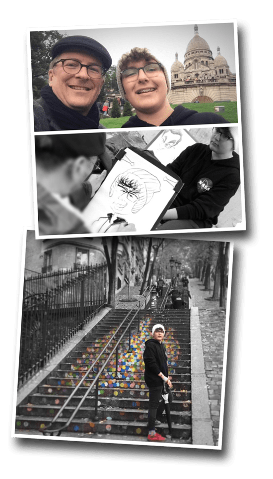 Timo wasn’t particularly keen on doing the stairs to the top of the dome (like I’d done with Dominic), not to mention it was a foggy, drizzly day so visibility was poor. We did do the initial stairway up Rue Foyatier however and he got a caricature done in Place du Tertre. He was very pleased with the result.