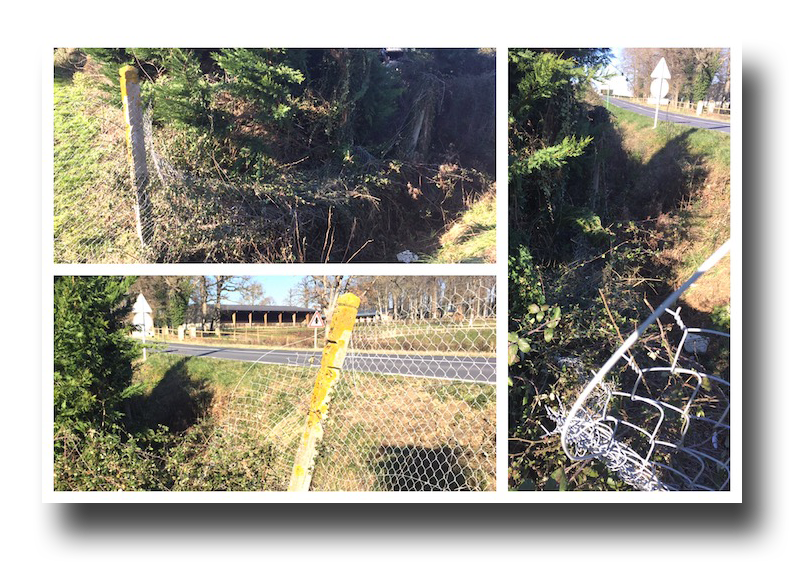 A portion of the fence, at the bottom of the yard, had been torn down in an accident. A utility trailer had come unhitched from the truck hauling it and it careened into the ditch, taking out part of our fence.