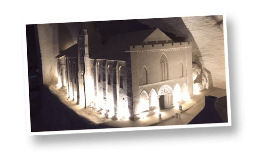 We visited the Pierre et Lumière (Stone and Light) exhibit, just a couple of kilometers from the manor. This is an underground tunnel in the cliff-side, where self-taught sculptor Philippe Cormand spent years carving scale models of numerous regional monuments.