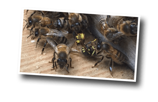 Bees react to hornet / wasp intruders by ‘balling’ them. They completely cover them, a couple bee-layers deep and vibrate their bodies. This creates heat and they essentially ‘cook’ the intruder to death. Honeybees are able to sustain body temperatures a couple of degrees higher than wasps, making this method possible.