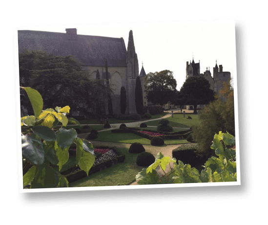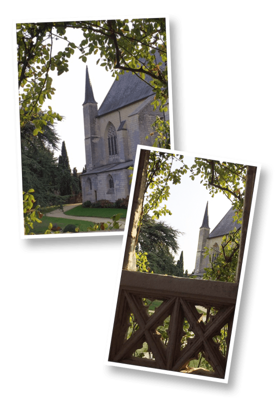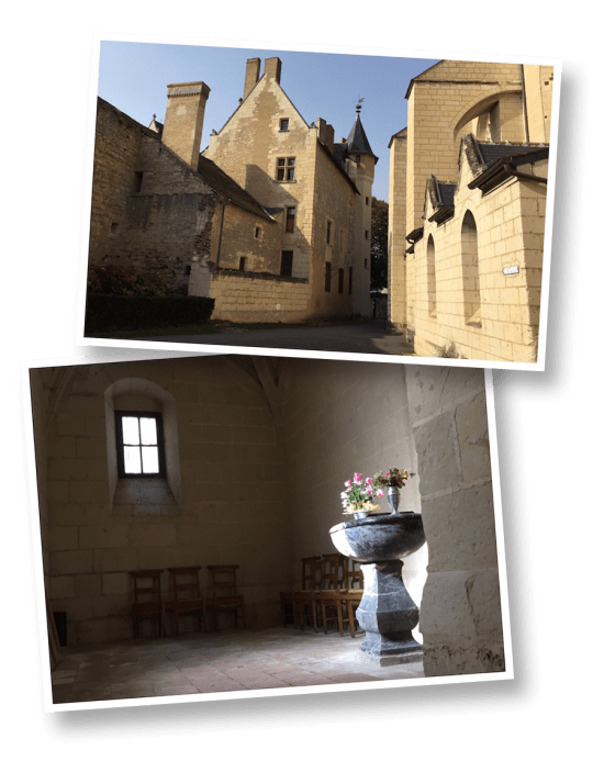 To the right of the church, you can see the historical residence, perched atop the hill between the entrance and the Thouet River, below.