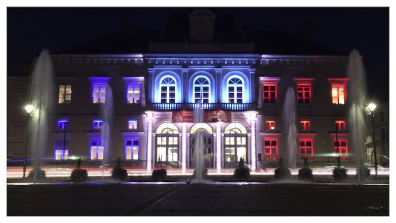 Our local city hall has been adorned in the colours of the French flag of late. I saw it on my walk downtown the other night, while waiting for Dominic to arrive and took this picture. Lit up, and with the fountains rat-a-tat-tatting out front, it’s even more beautiful. It just seemed appropriate to share that picture today.