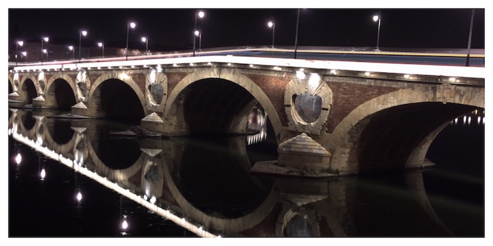 Above is Toulouse’s city hall on the Place du Capitole. The colour hasn’t been enhanced, this is what it looks like in the afternoon sun. The vibrancy of the colour isn’t quite as evident in the photo below (because it was taken at night during an evening stroll), but you can still see it nonetheless in the bricks used to build the ‘Pont Neuf’ (the New Bridge) that spans the Garonne River.