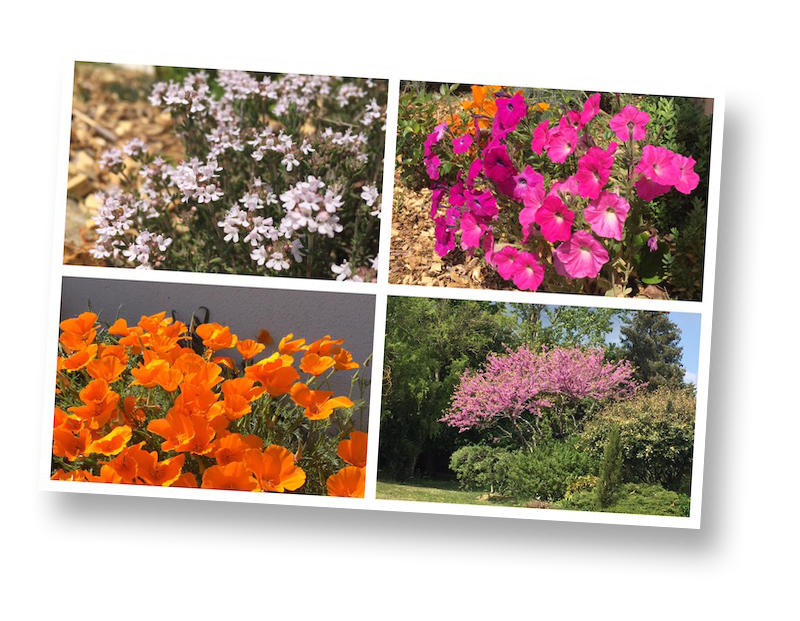 Despite that, things are blooming in the church yard. Beginning top left and moving clock-wise, you’ll see thyme, pink petunias (that overwintered!!), European redbud, and California poppies.