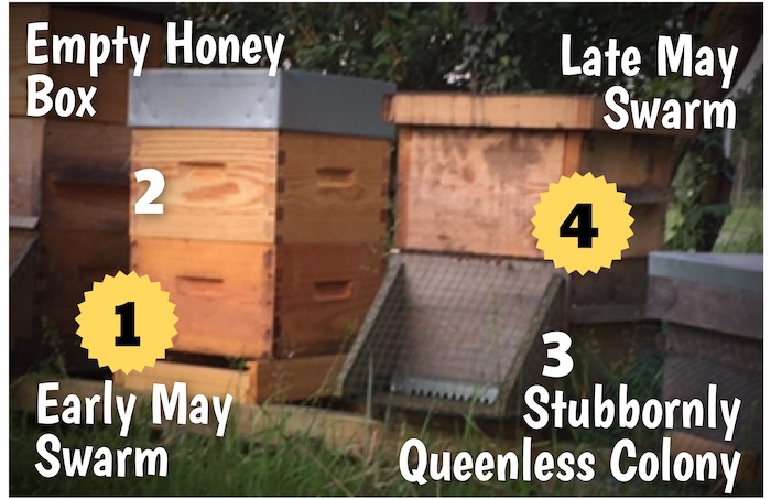 I placed weak & dwindling box 2 over a healthy natural swarm from early May that was starting to run out of space. Since there was drawn comb, it would give the larger colony a place to immediately store nectar.