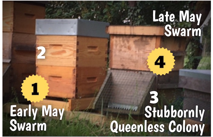 I figured I’d fix box 3 by combining them with a lat-May swarm (box 4). The only problem…. they (box 4) didn’t have a queen either, BUT the workers were not yet laying so I knew I could put a frame of eggs in there and they’d raise a queen. These two boxes were separated with a screen (I wanted their smells to merge, but didn’t want them to be able to mix just yet).