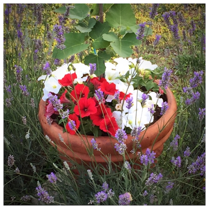 The potted fig is in a spot surrounded by several lavender plants… also started from rooted cuttings.