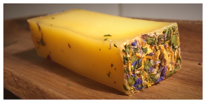 The Tomme aux Fleurs is made by adding dried petals from a number of edible flowers (mallow, bachelor button, calendula, strawberry, rose and dandelion) to the rind of the cheese is still wet and before it gets set aside for maturing. Due to the timing, the cheese is still ‘taking on’ its definitive flavour and the flower petals are able to contribute to it.