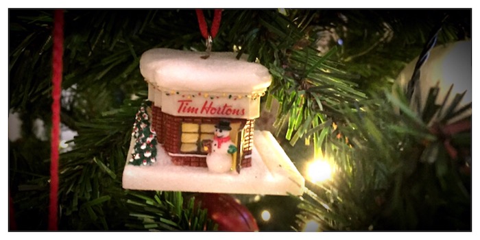 So at one point, when Tims came out with a series of Christmas ornaments… one found their way into each of the kids’ stockings. We have this one, a little yellow box of Timbits and a chocolate-glazed timbit on a toboggan.