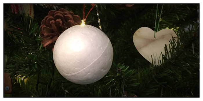 I don’t know why we never thought of it before. Actually, even if someone had thought about it or mentioned it to me… I probably would’ve poo-pooed the idea as being too banal, too common, too unfinished. For you see, today’s ornament is a simply styrofoam ball, hanging on a thread.