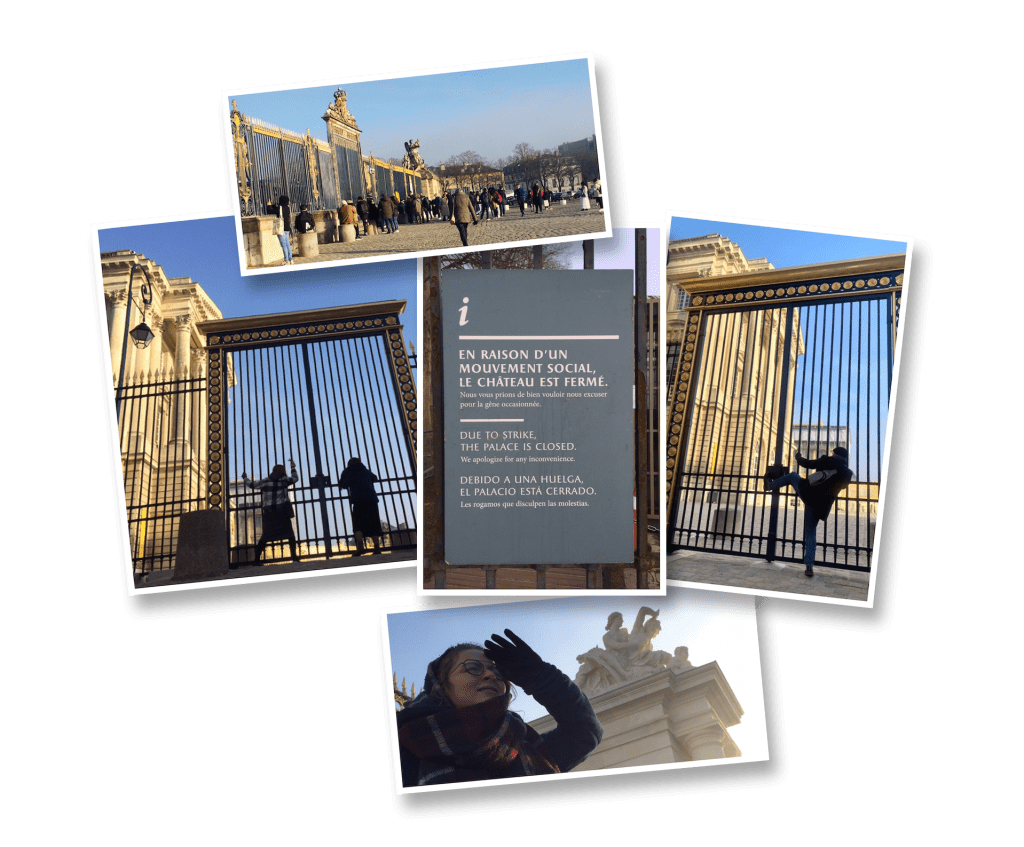 We managed to find free parking (a rarity in Versailles. Otherwise… it runs around 35€ / 4h), and as we made our way toward the Palace’s main entrance, we saw a couple of signs that chilled our enthusiasm: “Due to strike, the palace is closed”.
