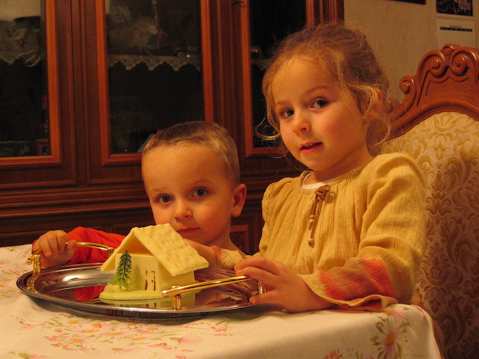 On this same particular European trip, after Holland & Paris, we all spent some time with Liz’s family in the tiny village where she grew up. Sophie & Dominic enjoyed being spoiled by their grand parents, and this included devouring little white-chocolate Christmas cottages which, as you can see, were presented to them in the most distinguished of manners… on a silver platter!