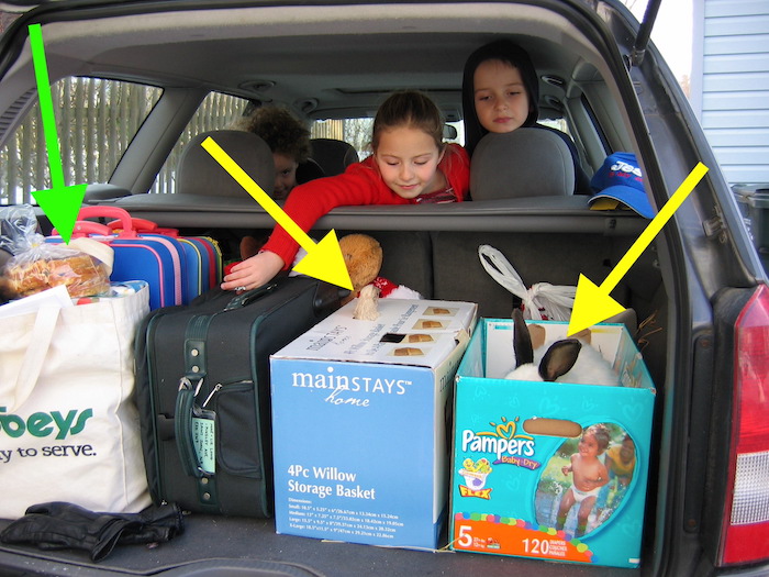 Next to him, on the left in the photo, you have to look verrrry closely, but you’ll see the head of one of our hens sticking up out of the box. Yes… you’re not imagining it … one of the hens joined the rabbit, and the humans, in preparation for a weekend in the country.