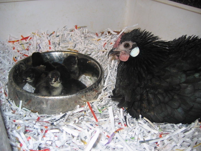 We noticed, at one point in December, that one of the hens was getting to be broody and wanting to sit on eggs, so we moved her to a smaller pen (also in the basement) and let her do her thing.