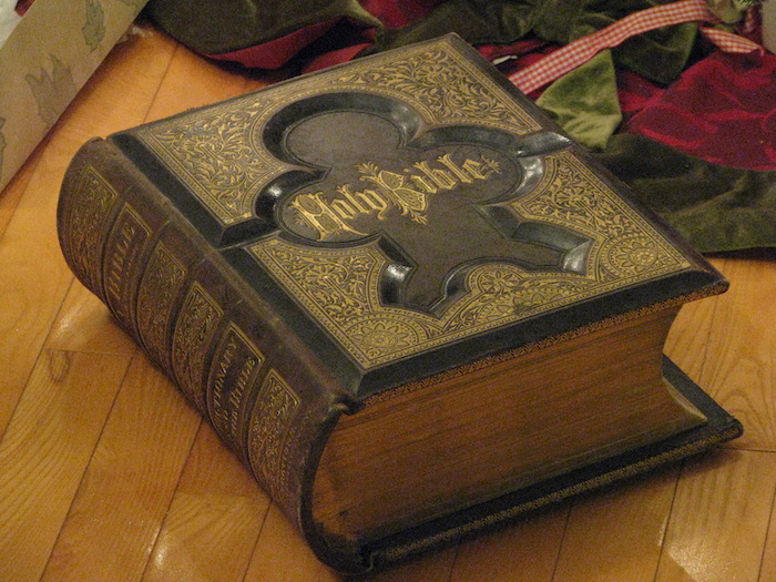There are two old family-related Bibles that came into my possession years ago and while they not, per sé, particularly Christmas-related, these photos of them were taken beside the Christmas tree way back in 2012… that still counts, right?