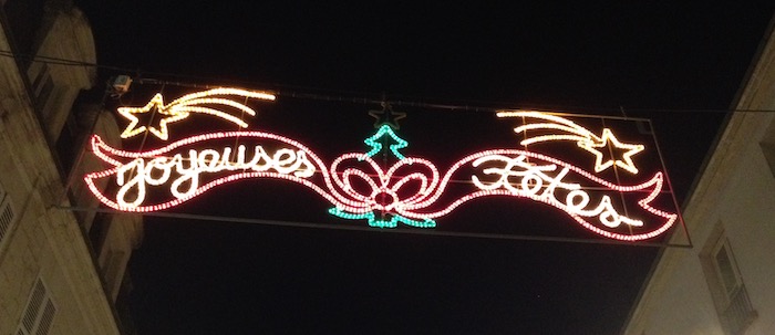 “Joyeuses Fêtes” … the non-descript French equivalent of “Happy Holidays,” devoid of any particular religious affiliation, greets us from a sign suspended above the old working class neighbourhood of Châteauneuf. That’s not our neighbourhood, but it’s the part of town through which you pass to get to downtown.