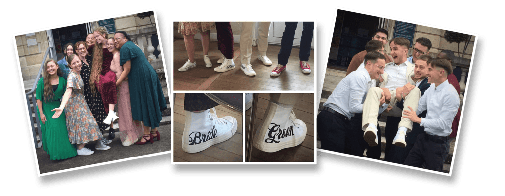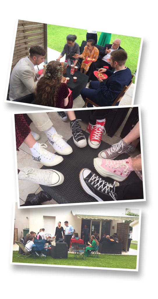 To make it a bit more fun, Dominic and Melanie had customized Converse sneakers made for the occasion: White, with the words Bride and Groom on them, and they invited others to come in Converse as well.